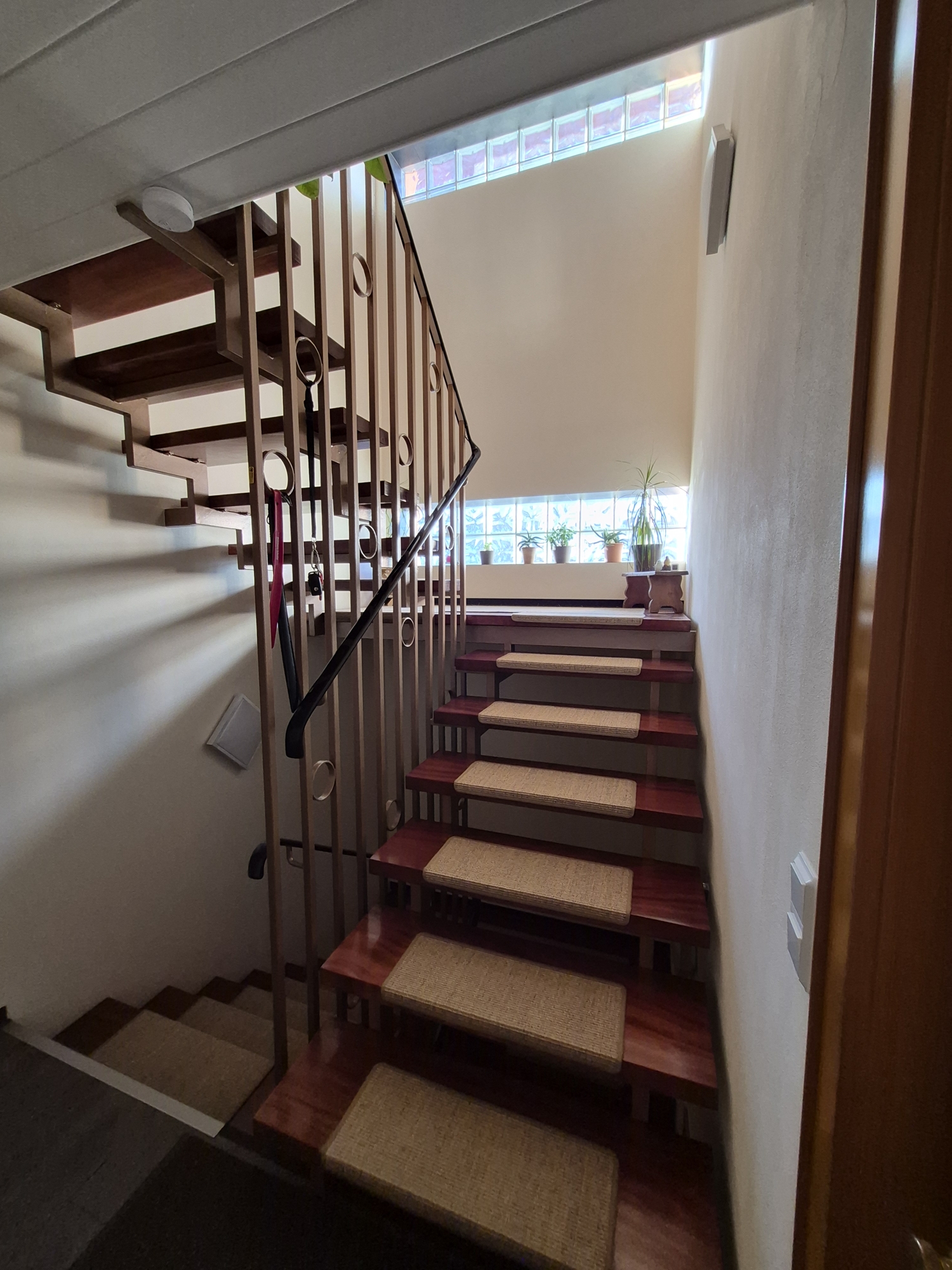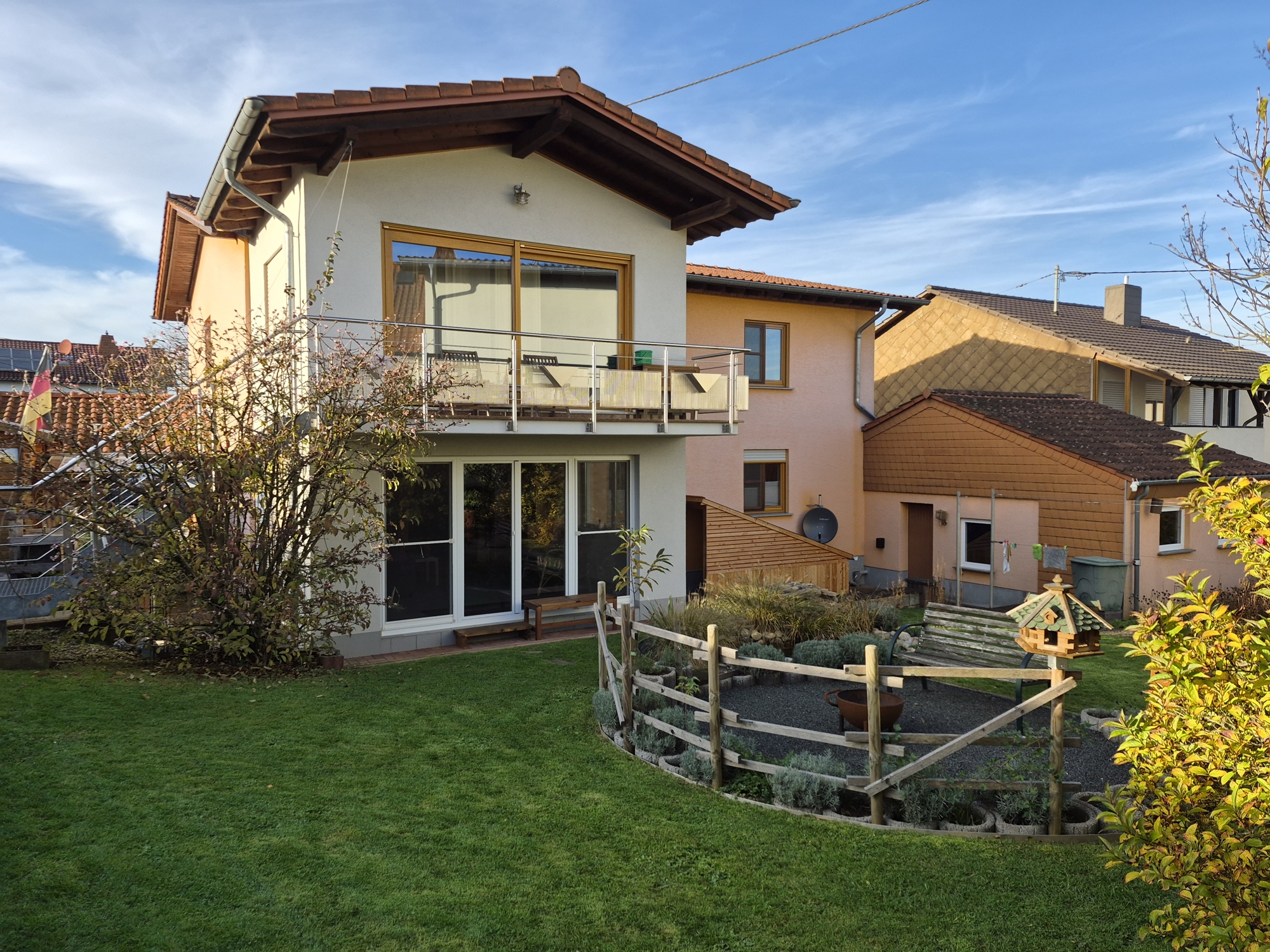 Ein weiterer Pluspunkt ist der Balkon im Obergeschoss, der einen freien Blick in die grüne Umgebung bietet und zum Entspannen an warmen Tagen einlädt.